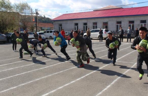 运动会进行了持球、白菜丰收、50米赛跑、背媳妇、插秧苗、呼啦圈竞走、50米拍球跑、小猪快跑、蚂蚁搬家、粮食大丰收等趣味项目。