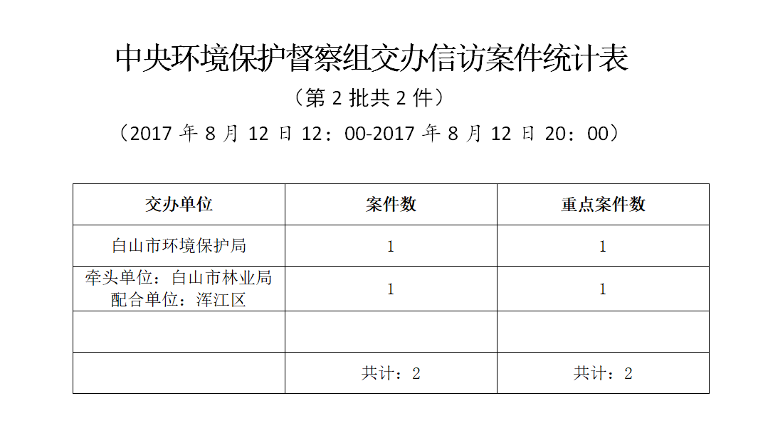 8月13日,中央第一环境保护督察组向白山市交办了第2批举报受理信访事项2件(重点案件2件),共涉及2个环境问题,其中涉气1个、生态1个。共涉及1个县(市、区)和2个市直部门,其中由市林业局牵头,浑江区配合共同查处1件、市环保局1件。中央第一环境保护督察组所有交办问题已全部第一时间交办相关县(市、区)及市直部门进行办理。上述县(市、区)及部门正在积极行动,立接立办,边督边改,迅速组织核查,依法依规办理、问责。