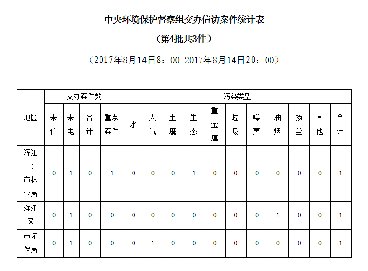 8月15日,中央第一环境保护督察组向白山市交办了第4批举报受理信访事项3件(重点案件1件),共涉及3个环境问题,其中涉气1个、生态1个、油烟1个。共涉及1个县(市、区)和2个市直部门,其中浑江区2件、市林业局1件、市环保局1件。